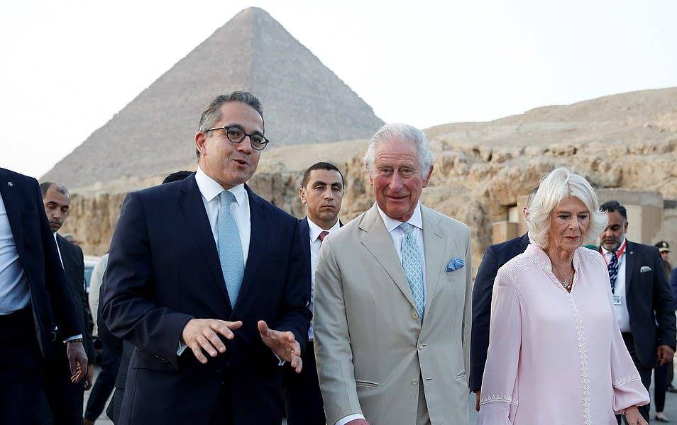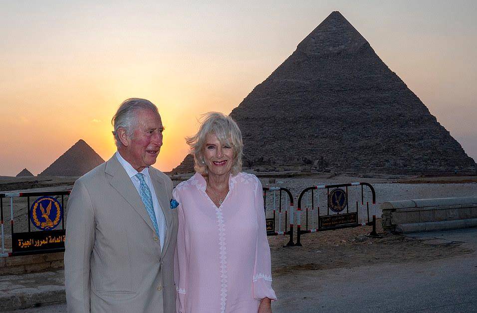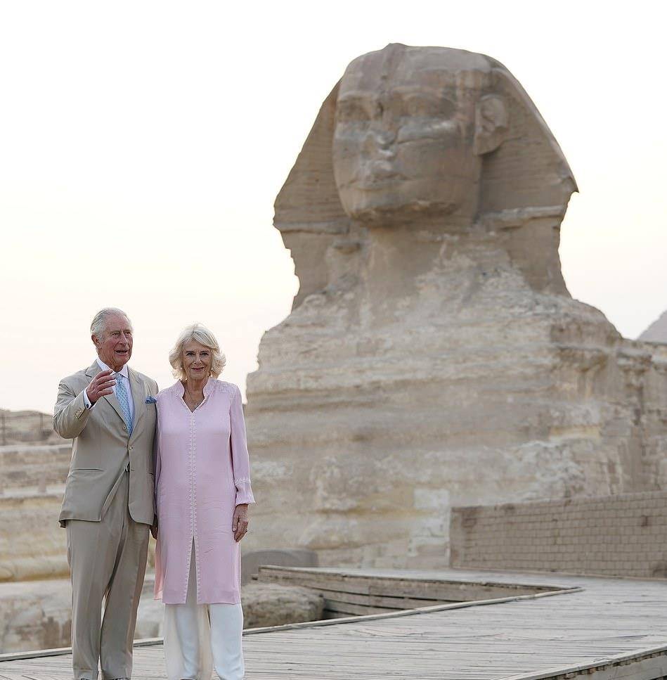 夕阳西下,卡米拉与查尔斯王子在金字塔前合影留念。卡米拉的小鸟太温柔了。这精致的妆容,让74岁的卡米拉一点都不像老太太!