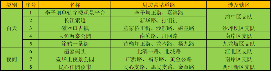 新晋网红景区方面,白天时段的渝中区李子坝单轨穿楼观景平台、南岸区大鱼海棠公园、九龙坡区涂鸦一条街,以及夜间时段的江北区鎏嘉码头、南岸区壹华里夜景公园、两江新区民心佳园夜市等新晋网红景区周边道路流量也将明显增加,详见下图: