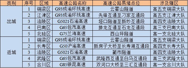 其中,G65包茂巴南收费站、G5021石渝南岸收费站、G50沪渝江北收费站、G65包茂渝北收费站、G75兰海北碚收费站、G93成渝环线沙坪坝收费站、G85银昆高新收费站等进城收费站将呈现车多缓行态势,如下图所示: