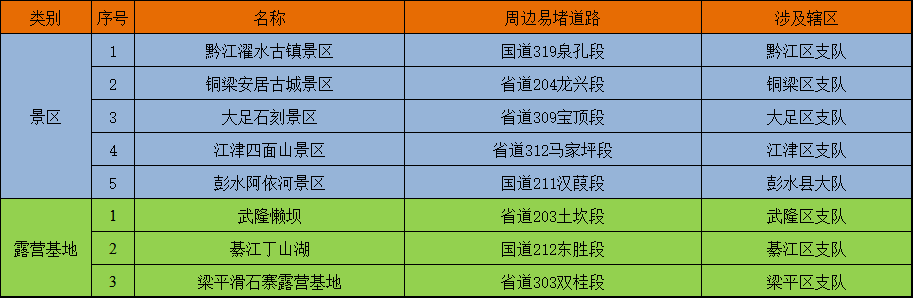 区县景区方面,预计黔江濯水古镇、铜梁安居古城、大足石刻、彭水阿依河等近郊景区出行热度较高,易堵时段集中在11时至14时。露营基地方面,预计武隆懒坝、綦江丁山湖、梁平滑石寨露营基地等热门露营基地将迎来游客出行高峰,易堵时段集中在16时至19时30分,详见下表: