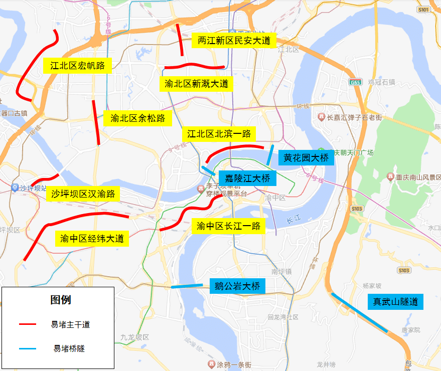 核心干道和骨架路网方面,渝澳大桥、嘉华大桥、石门大桥、石黄隧道、金山大道、建新东路、龙华大道等桥隧及核心干道通行压力较大。聚餐聚会方面,江北区洋河片区(北城天街、鲤鱼池路、洋河路、洋河中路)、渝北区黄泥磅片区(五红路、紫荆路、黄龙路、紫福路)、南岸区回龙湾片区(学府大道、回龙路、青龙路、南湖路)等聚会聚餐热门区域周边道路易出现时段性拥堵,如下图所示: