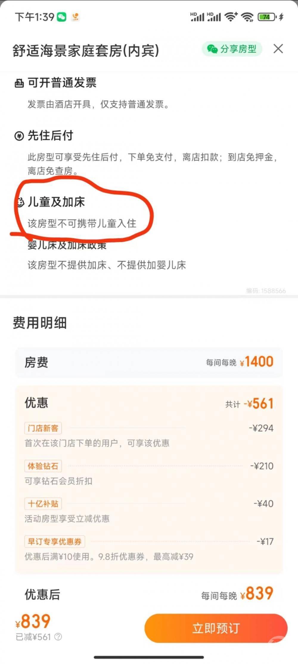 ▲某APP上,该酒店注明了“该房型不可携带儿童入住”。 图片来源/截屏