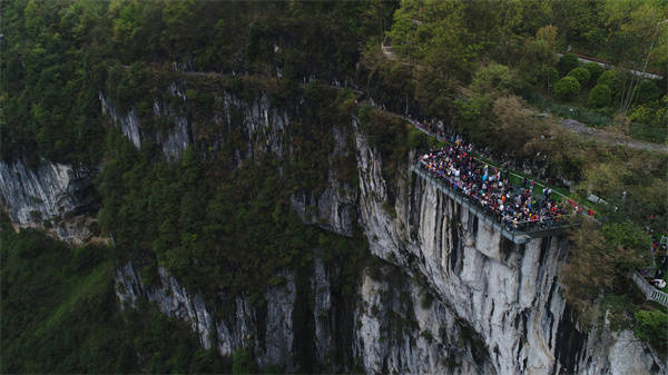 考察团首先来到了被誉为“亚洲最大天生石桥群”的天生三桥景区,参观了世界单体面积最大的天生三桥悬崖玻璃眺台。站在悬空高度达280米的悬崖玻璃眺台上,惊险刺激的感官视觉引发考察团成员惊叫连连。