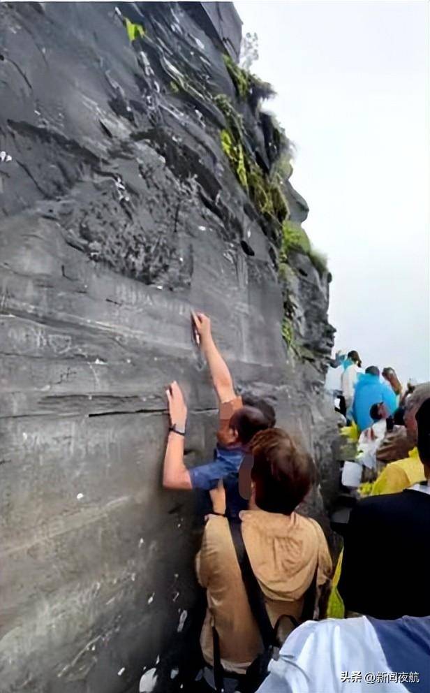 6月18日,游客在梵净山金顶摩崖刻字(网传视频截图)