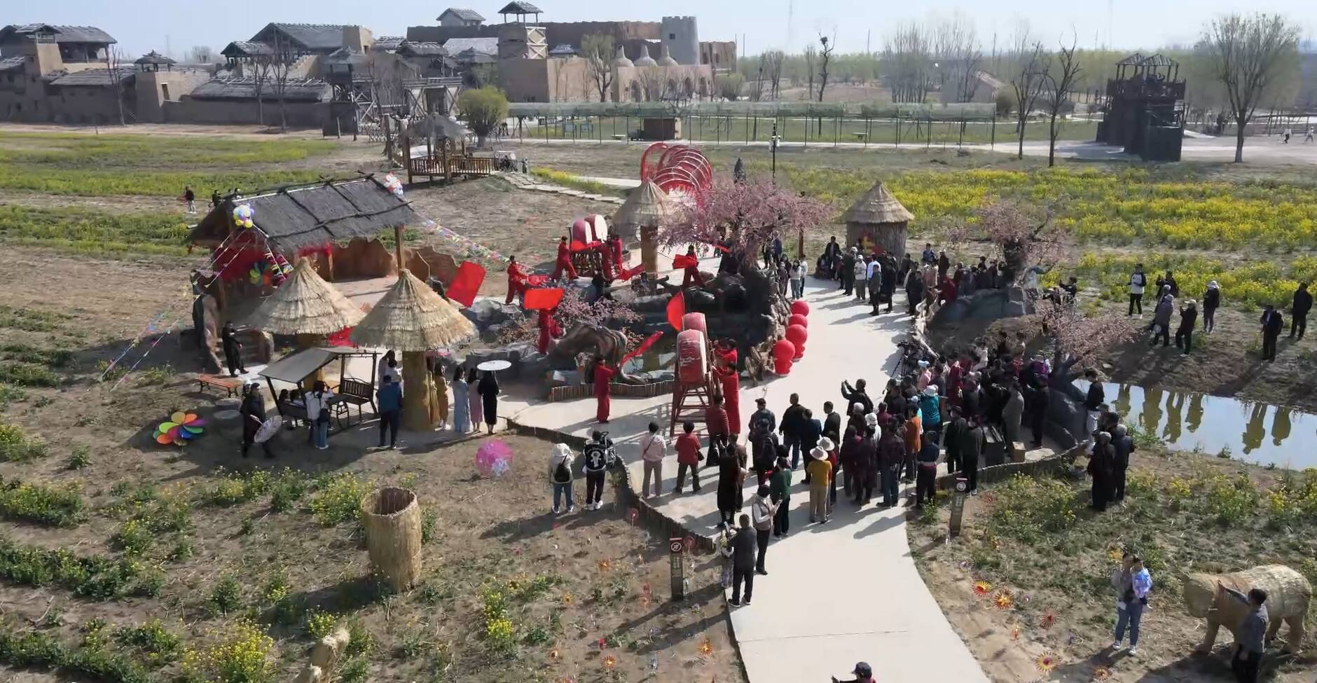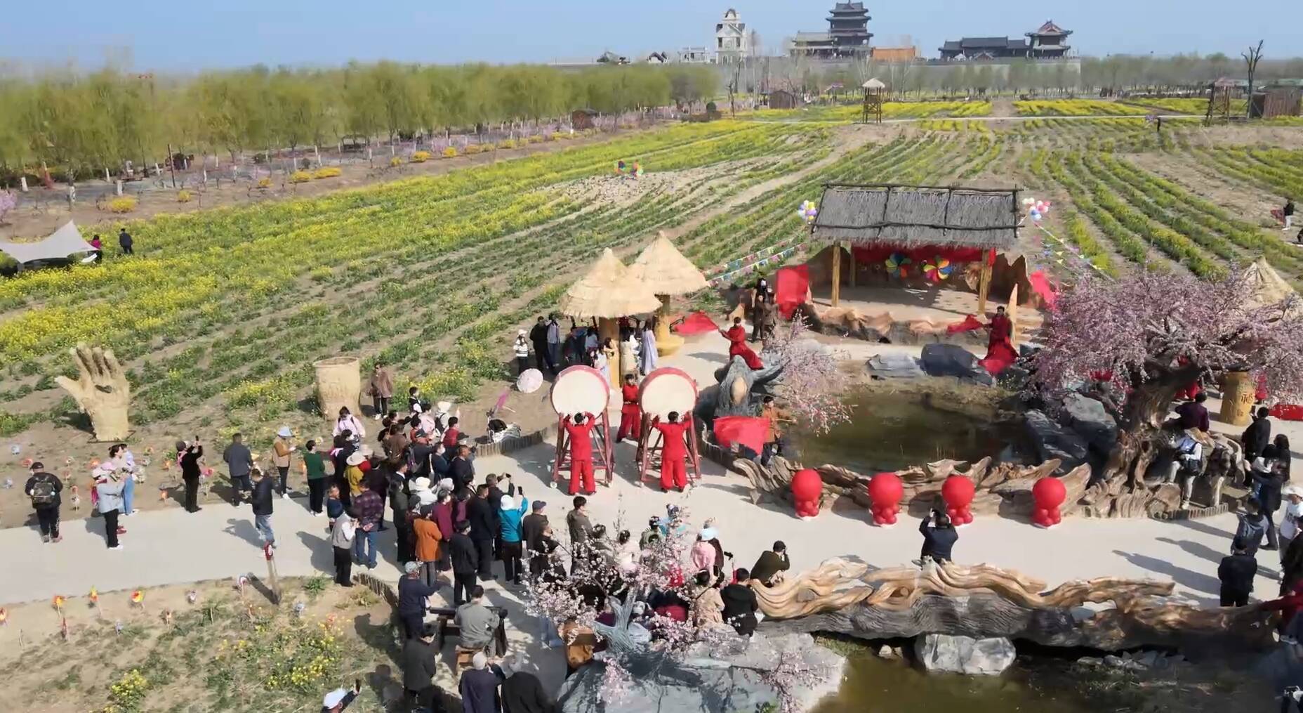 走进红高粱影视城,成片油菜花竞相开放,犹如一片随风翻滚的金色海洋,吸引了众多游客和摄影爱好者踏青穿行其间,感受春的气息。田野里活灵活现的稻草卡通、形状各异的风铃,微风拂柳,让整个景区内的风铃闻风而动,交织奏响了春天的旋律。
