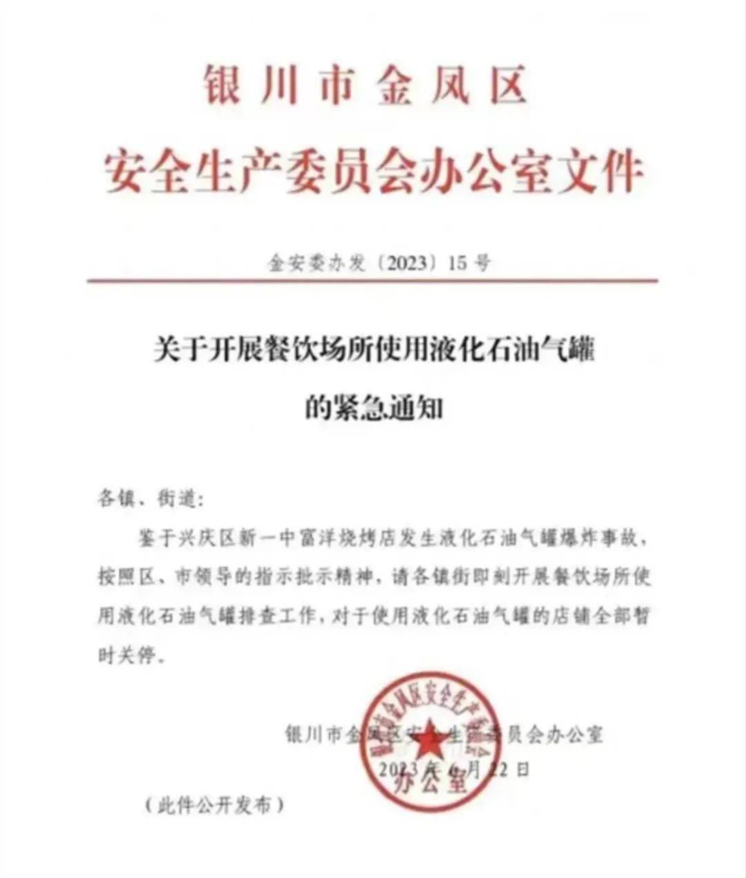 一张网络图片显示,一份署名为“银川市金凤区安全生产委员会办公室”的《关于开展餐饮场所液化石油气罐的紧急通知》显示,鉴于兴庆区新一中富洋烧烤店发生液化石油气罐爆炸事故,按照区、市领导的指示批示精神,请各镇街即刻开展餐饮场所使用液化石油气罐排查工作,对于使用液化石油气罐的店铺全部暂时关停。