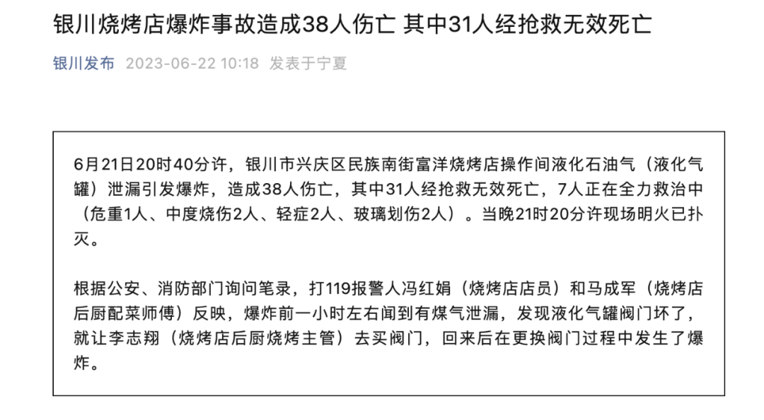 6月21日20时40分许,银川市兴庆区民族南街富洋烧烤店操作间液化石油气(液化气罐)泄漏引发爆炸,造成38人伤亡,其中31人经抢救无效死亡,7人正在全力救治中。