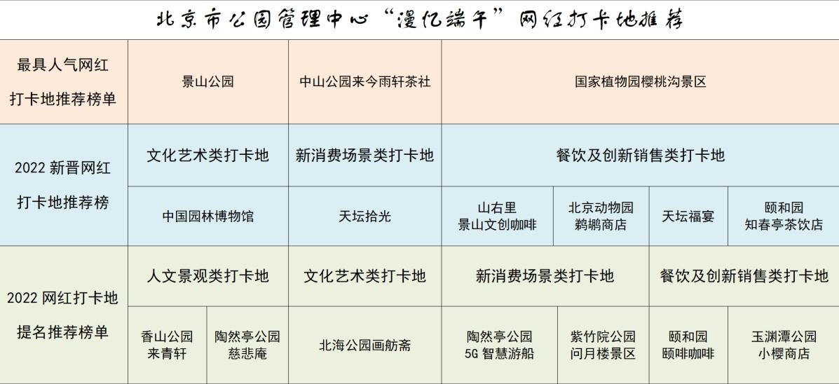 此外,北京市公园管理中心推荐北京市属公园、国家植物园(北园)及中国园林博物馆16处网红打卡地,包括景山公园、中山公园来今雨轩茶社、国家植物园樱桃沟景区、中国园林博物馆、天坛拾光、山右里景山文创咖啡、北京动物园鹈鹕商店、天坛福宴、颐和园知春亭茶饮店、香山公园来青轩、陶然亭公园慈悲庵、北海公园画舫斋、陶然亭公园5G智慧游船、紫竹院公园问月楼景区、颐和园颐啡咖啡、玉渊潭公园小樱商店等。这些场所、空间为满足多层次、个性化游园需求,在端午期间同时提供精彩的节日活动,市民游客可就近游览、纳凉消夏。