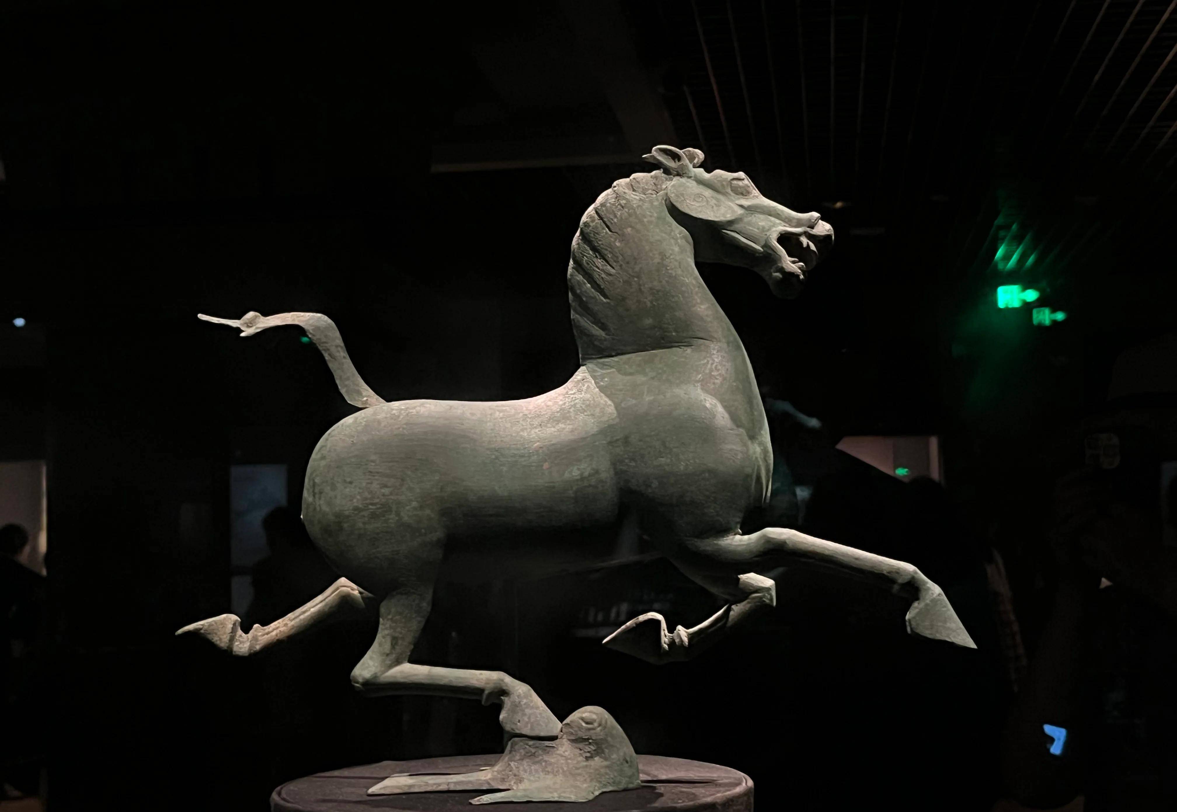 作为甘肃省博物馆的镇馆之宝~马踏飞燕,它形象矫健俊美,别具风姿。铜马昂首嘶鸣,躯干壮实而四肢修长,腿蹄轻捷,三足腾空、飞驰向前,一足踏飞燕。