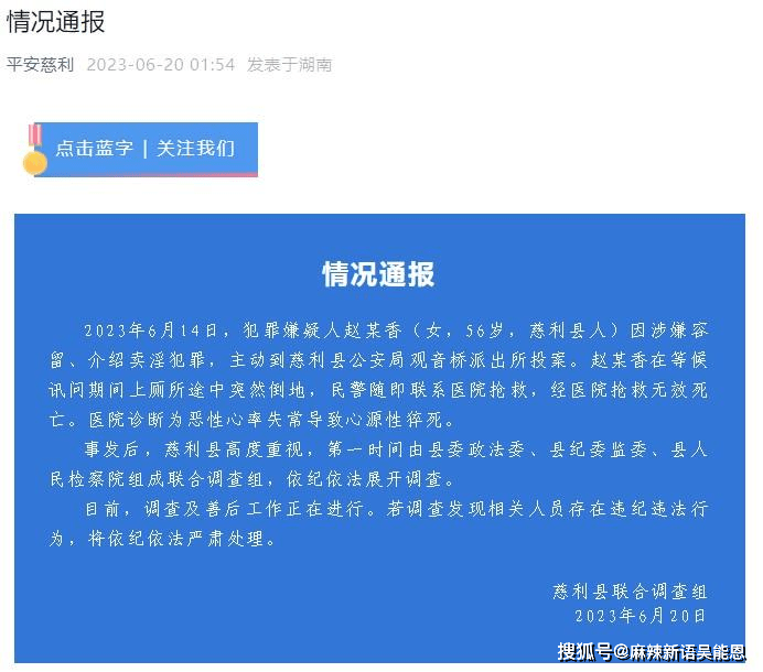 2023年6月14日,犯罪嫌疑人赵某香(女,56岁,慈利县人)因涉嫌容留、介绍卖淫犯罪,主动到慈利县公安局观音桥派出所投案。赵某香在等候讯问期间上厕所途中突然倒地,民警随即联系医院抢救,经医院抢救无效死亡。医院诊断为恶性心率失常导致心源性猝死。
