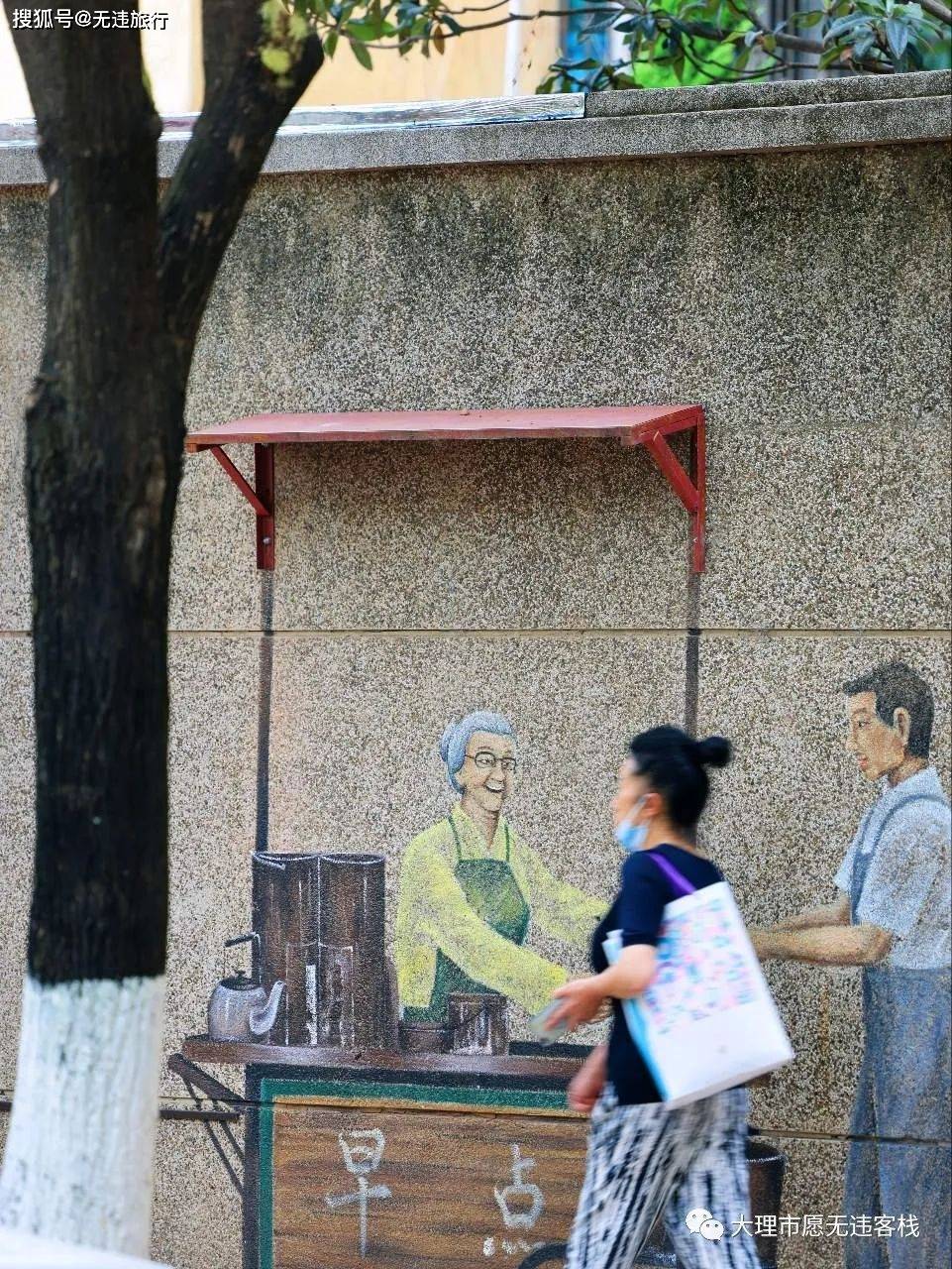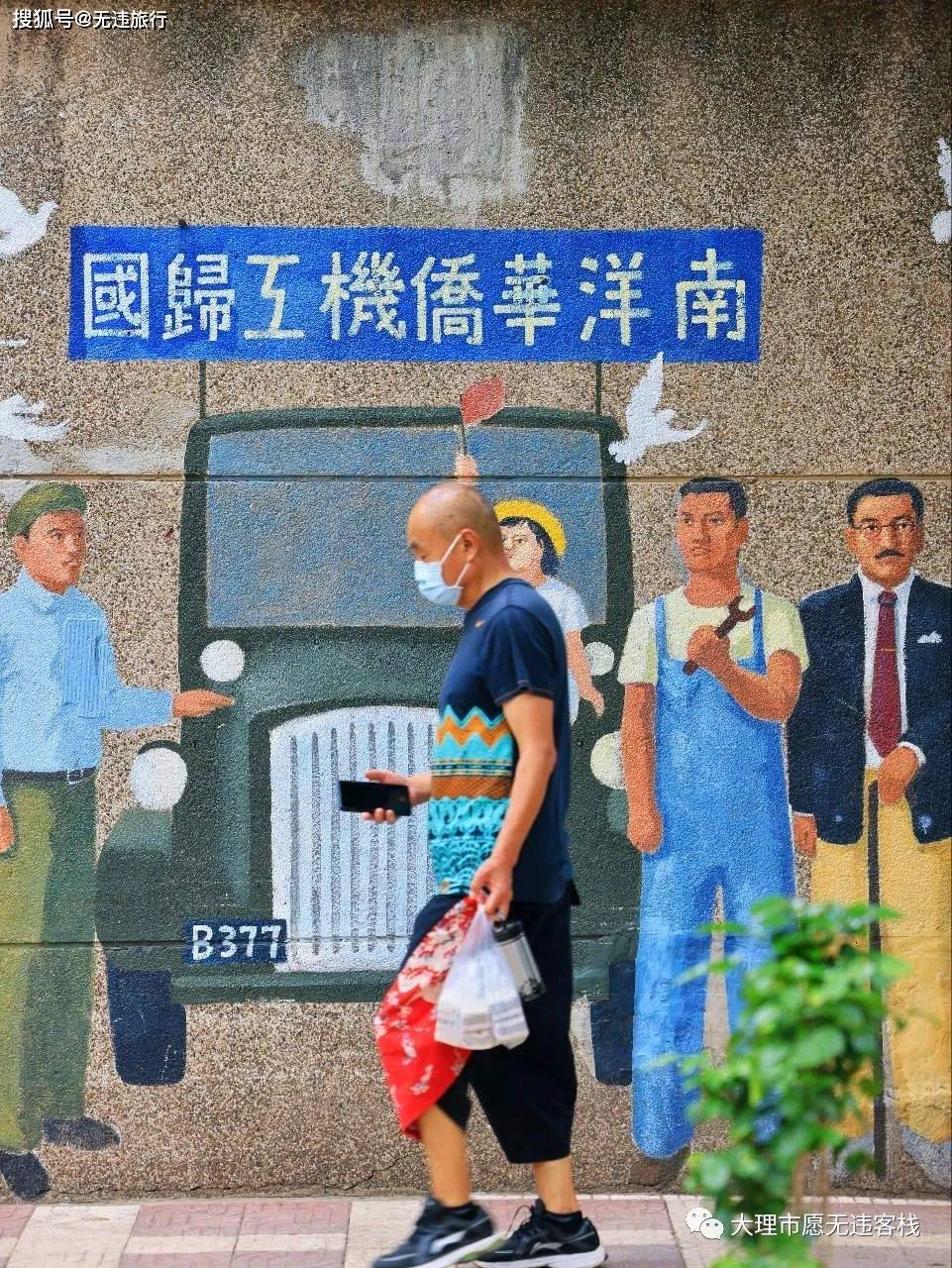 在街道一侧的围墙上,还有丰富多彩的文创壁画,古老和现代交织在一起,挺漂亮的。每当有路人经过,随便按下快门都是老街经典的美好记录。
