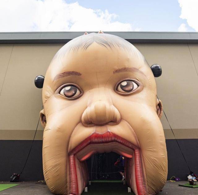 这个乐园以Stormi为主题,进场前就被巨大的Stormi充气头像给震住!和爸爸TravisScott去年的《Astroworld》的专辑封面一样,从Stormi的嘴巴走进去就是游乐园。