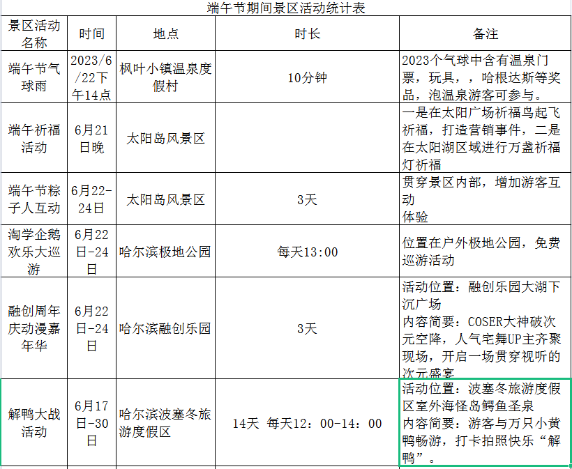 6月17日-30日,在哈尔滨波塞冬旅游度假区举办“解鸭大战活动”,每天12:00-14:00 。活动位置在波塞冬旅游度假区室外海怪岛鳄鱼圣泉内容简要:游客与万只小黄鸭畅游,打卡拍照快乐“解鸭”。
