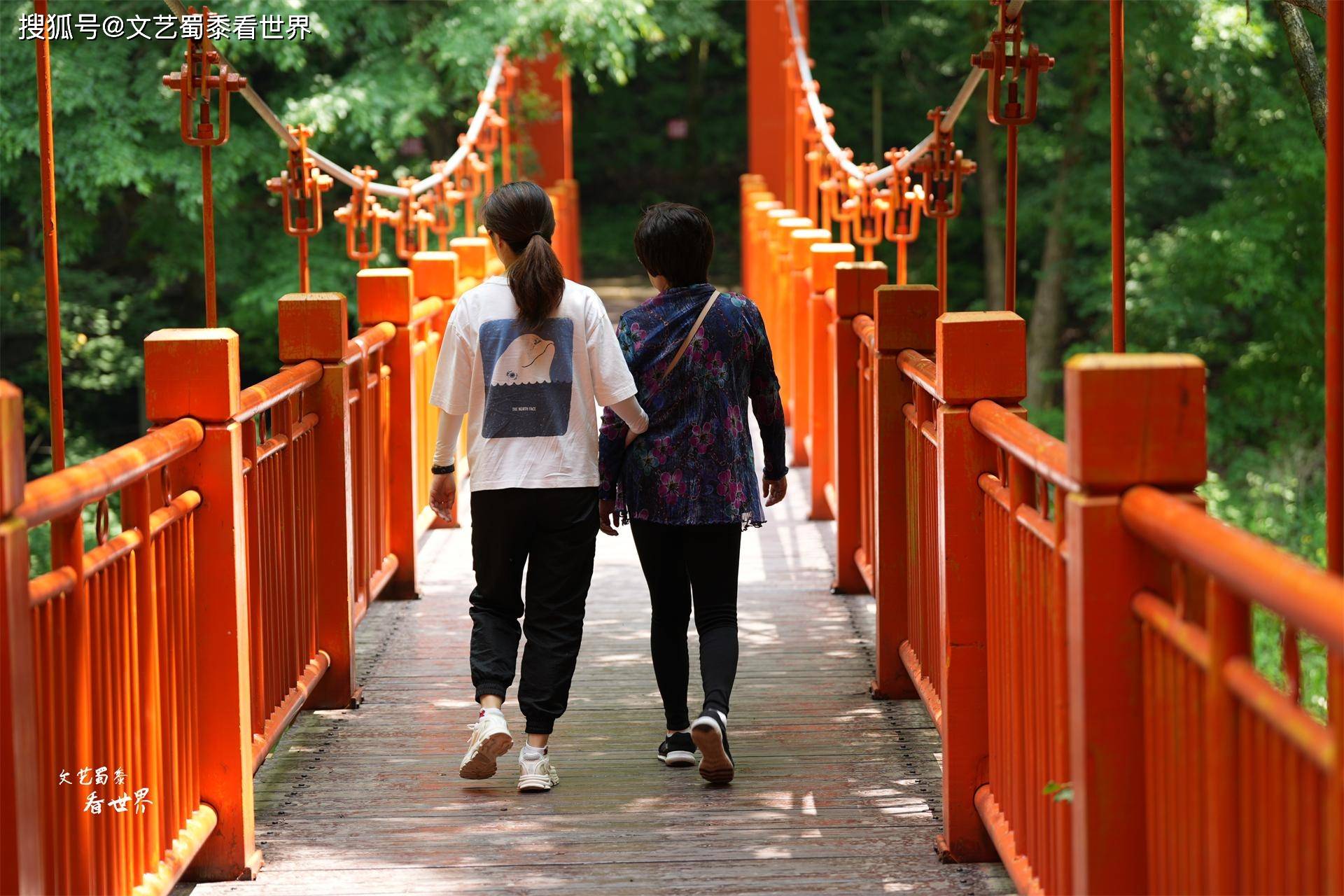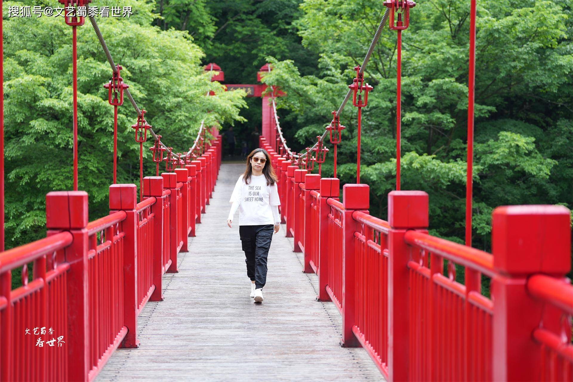 形容筐子沟用这段话最是恰当:“人在林中不见人,人在树下不见天”。我们在峡谷间穿梭,“红、橙、黄、绿、青、蓝、紫”七座吊桥最是惹人喜爱,它们都有好听的名字,诸如鸿运当头、绿树成荫等等。