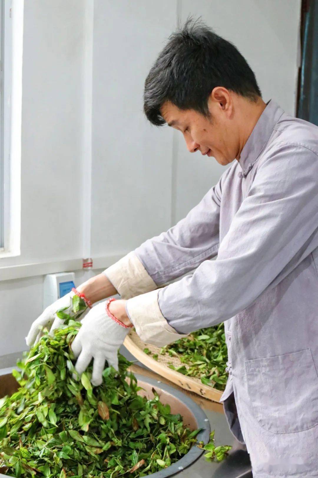 钦香制茶大师涂逸农在给新采摘五百年老茶树茶叶“炒青”。