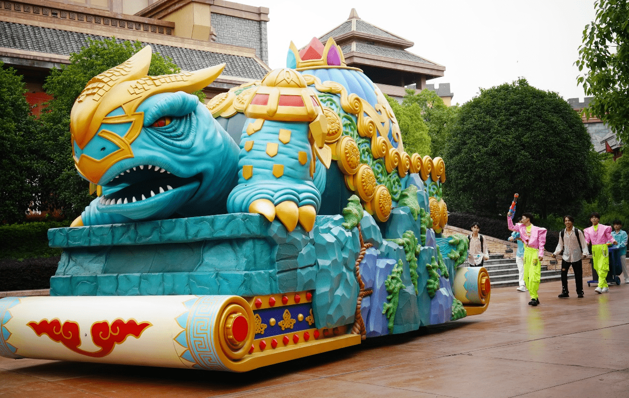 除了泼水互动活动,“夏日狂欢大巡游”也大受欢迎,三大主题方阵让现场热闹非凡。在花车巡游的队伍中,“神马花车”和“神龟花车”格外引人瞩目,大量游客在花车两边欢呼雀跃,与NPC们热情互动,欢乐氛围充满整座乐园。