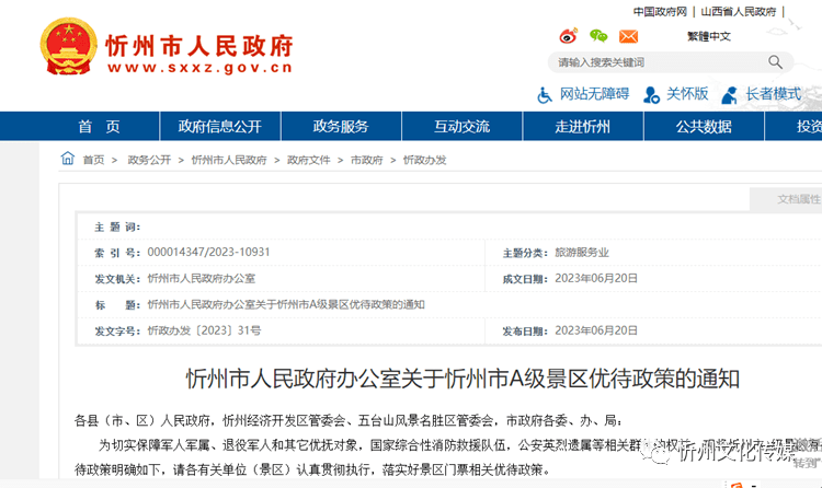 政策解读:《关于忻州市A级景区优待政策的通知》的政策解读