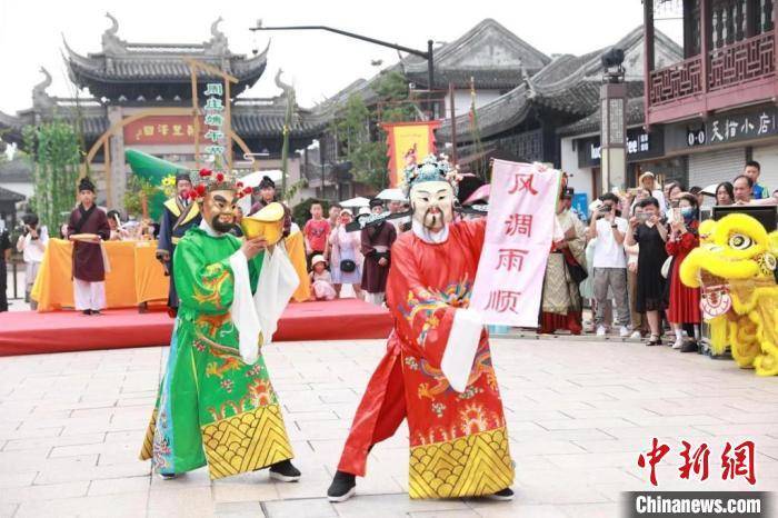 中新网苏州6月22日电 (记者 钟升)6月22日,农历五月初五端午节,在上海工作的台湾姑娘小杨选择了昆山的周庄古镇放松一下。小杨拖着行李箱,随着浩浩荡荡的祈福队伍一路行至周庄古牌楼前,欣赏着舞龙舞狮、打连厢、荡湖船、传统祭祀等端午水乡民俗表演。“就像家乡的庙会,大家祈福平安,许下美好愿望。两岸同根同源,让我感到非常亲切。”