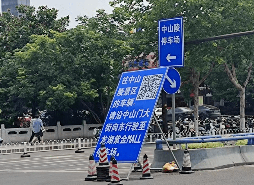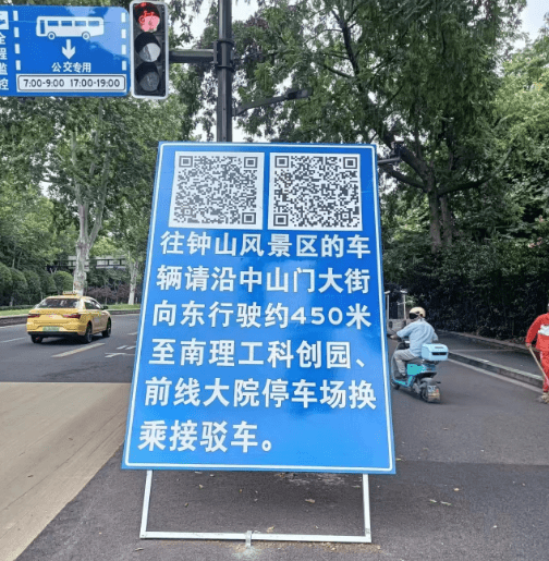 🔘 对中山门大街苜蓿园地铁站附近的标牌扫码,即可获取前往紫金文化广场、前线大剧院和南理工科创园的导航信息,这里距离中山门大街陵园路路口以东500米远,接驳车将从南理工科创园发车前往景区。