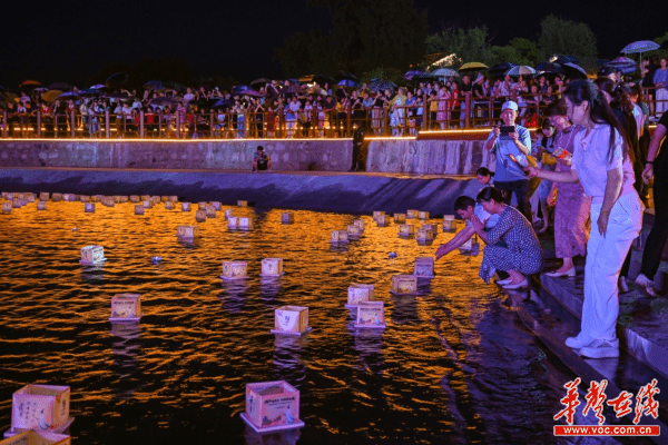 市民游客在屈子纪念园放河灯,缅怀屈原,祈福安康。郭立亮 摄