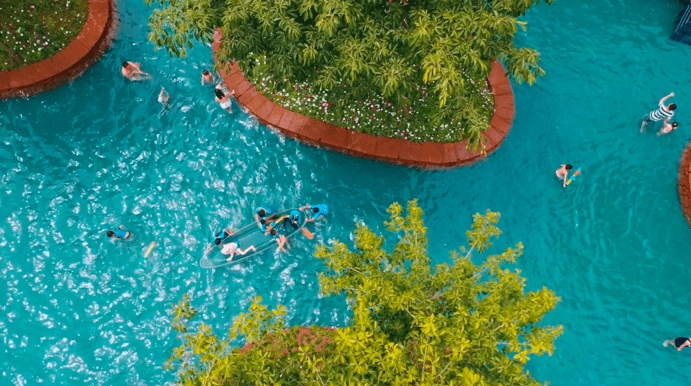 据悉,今年欢乐田园野趣戏水节再度焕新升级。不仅有巨型水枪、彩虹滑梯、水上闯关、水上麻将等超多野趣游玩项目,还有透明玻璃船、水上秋千、“多巴胺色系”泳圈等网红项目供游客美拍打卡。在群山环绕的龙溪谷,游客可以漫步池边小堤,也可以划着小船穿梭在林间,更能和萌娃一起在紫薇叠溪打水枪,在榕树池挑战水上闯关,妥妥的成都森系亲子耍水“天花板”。夜晚,“星空戏水”震撼登场,在绿水山林中,伴着满池“繁星”,游客可以尽情感受夏夜的清凉与魅力。