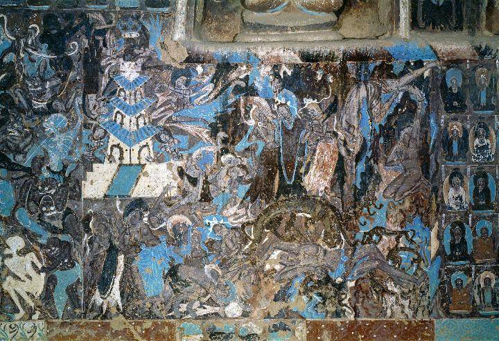 莫高窟第285窟营建于西魏,是莫高窟最早有纪年的洞窟,是一座“万神殿”。壁画中,有来自印度的飞天,有中国神话中的伏羲、女娲,有道教的朱雀、玄武。壁画中的日神形象,就有古希腊的太阳神阿波罗、佛教的日光菩萨、婆罗门教的太阳神等诸多解读。