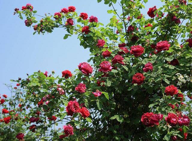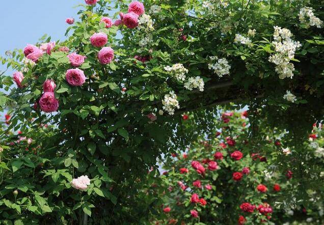花廊两旁,并列的树状月季恰到好处高过头顶,密集的花蕾多为深红色、浅红色。据了解,这里的树状月季是嫁接的,用蔷薇根做砧木,所以根系非常发达,花朵饱满,花瓣重重叠叠,盛开后,花盘大过成人手掌,艳丽四射。