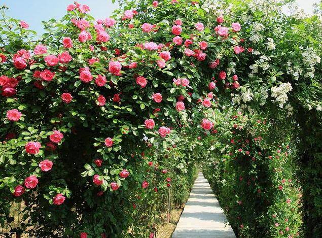走过木长廊,各种造型的花廊,仿佛打开了一个浪漫的童话世界:粉红色花廊、红色花廊、白色花廊、心形花环……每走一处,就别有洞天。