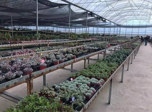 大棚占地3000多平方米,走进大棚,一色的多肉让人应接不暇,仔细一看,紫罗兰女王、火焰杯、玉扇等多肉植物品种一应俱全。
