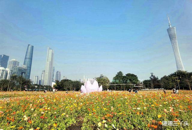 这个时候虽然是中午,但是来洪城公园赏花拍照的人还是挺多的。今年公园里的虞美人花海和去年的布置差不多,但是感觉小了点,最主要的是最外面的花盆是其他的花,所以感觉面积比去年小了点。今年有个改进,就是把花间里的石子路改成了水泥路,平路更方便游客行走和拍照。走过五彩缤纷的花径,抬头看见广州最高的三座建筑,即广州塔、东塔和西塔,被五彩缤纷的鲜花装点的城市更显美丽。自然的感觉。