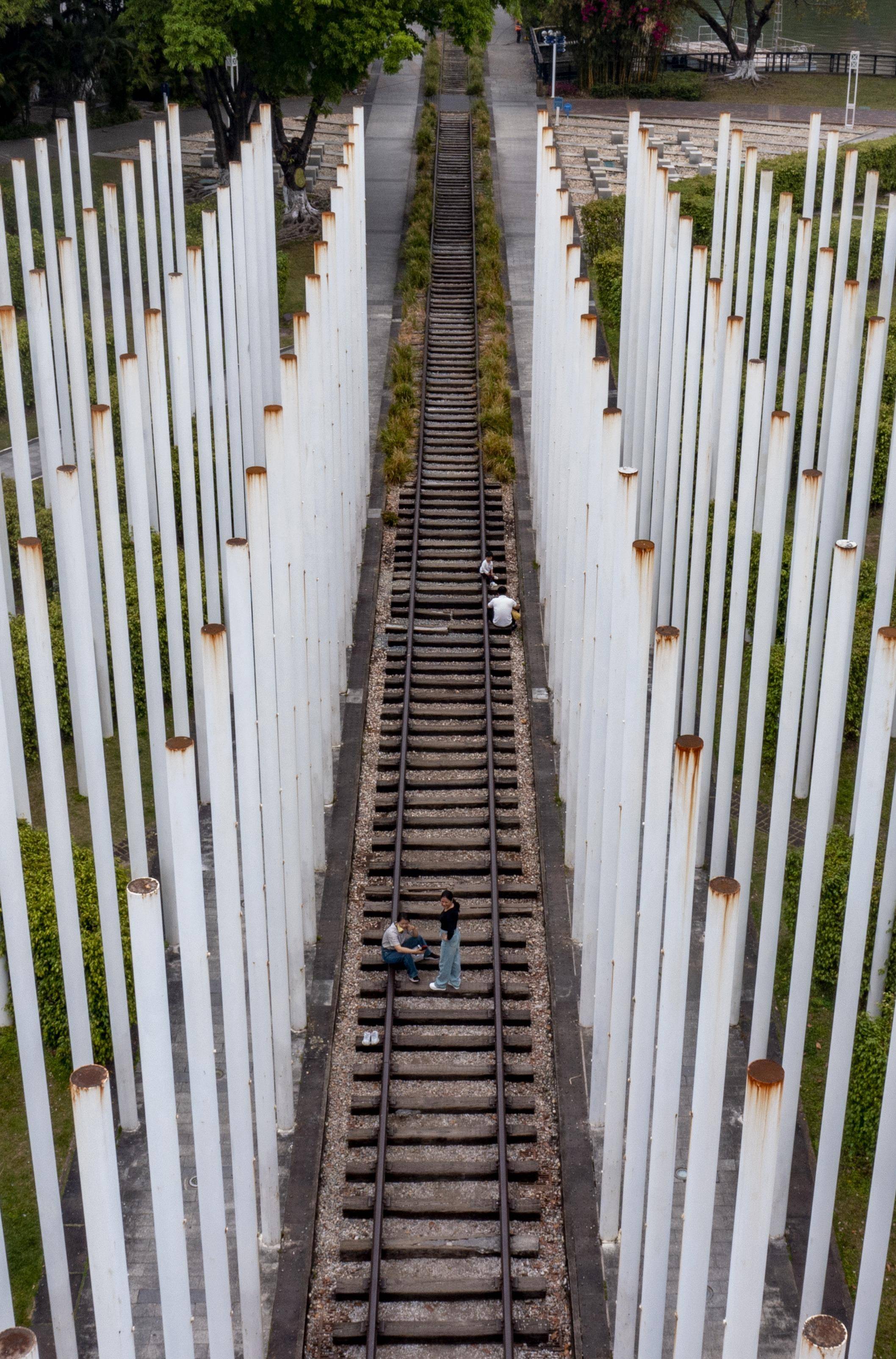 綦江公园没有围墙。从北门进入,首先映入眼帘的是长长的栏杆。这不是长途火车的轨道,而是越中造船厂留下的轨道。它是1950年代的产物,被用来调动物资,因为它不禁让人想起那段光荣的工业历史。