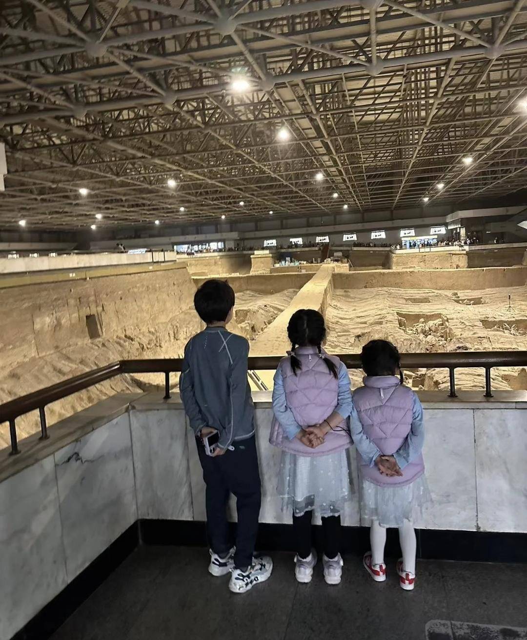 兄妹三人背着手,像老干部一样看着秦始皇兵马俑的宏伟场面。