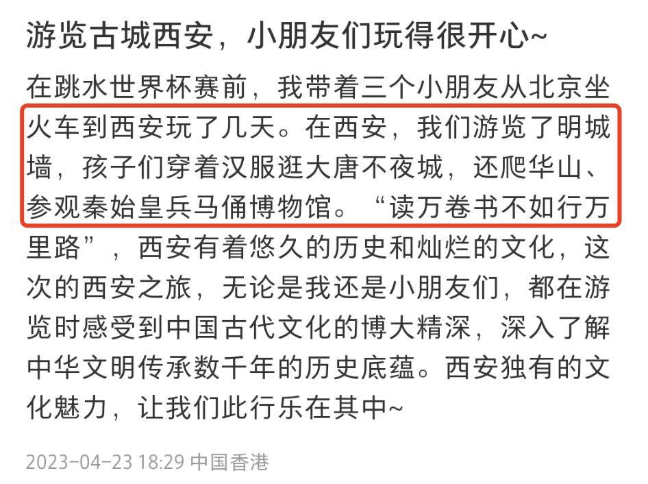 郭晶晶透露,孩子们去过西安很多地方,包括明城墙、大唐不夜城、华山、秦始皇兵马俑博物馆等。读万卷书不如行万里路。大人小孩都感受到了我们古老文化的深厚底蕴。