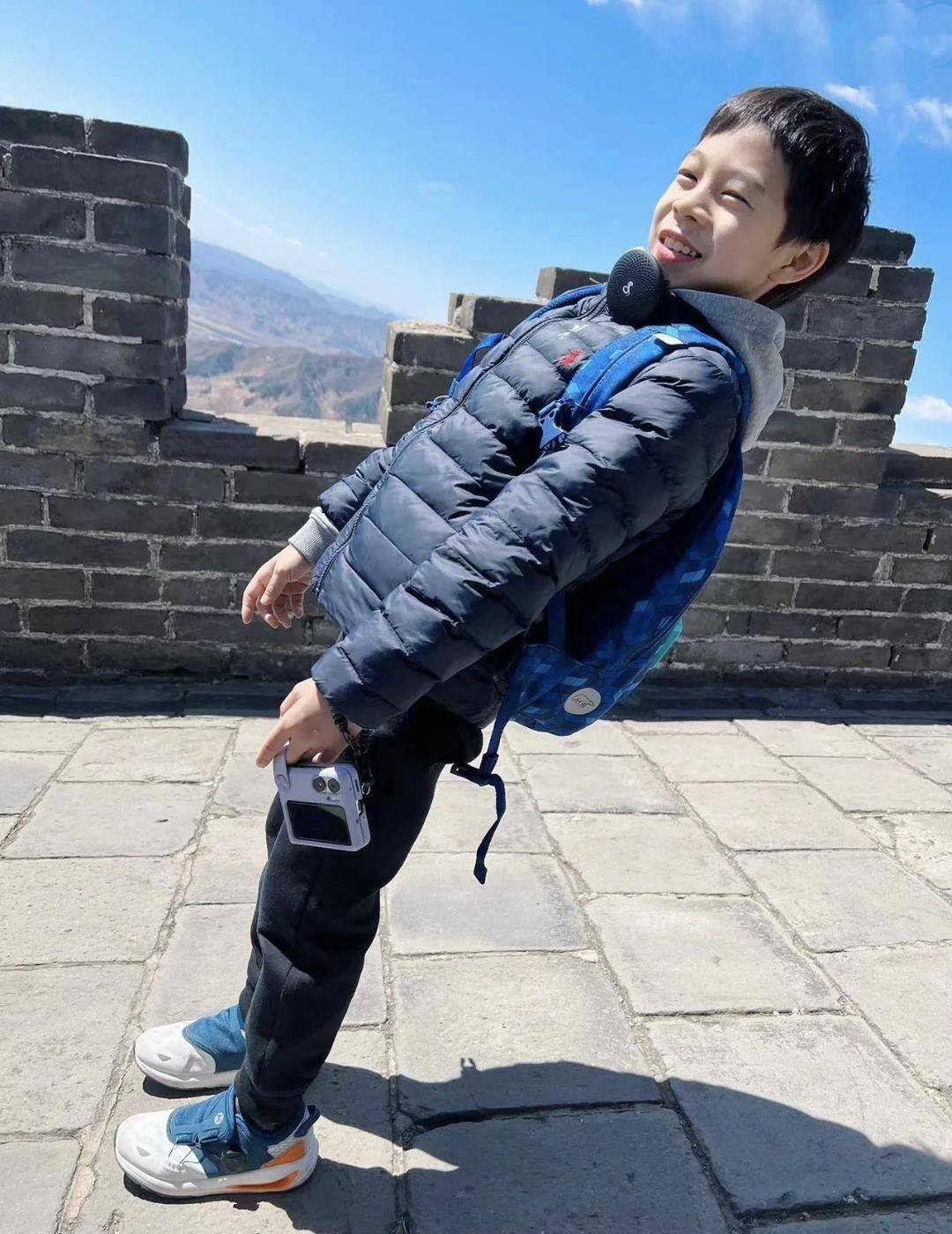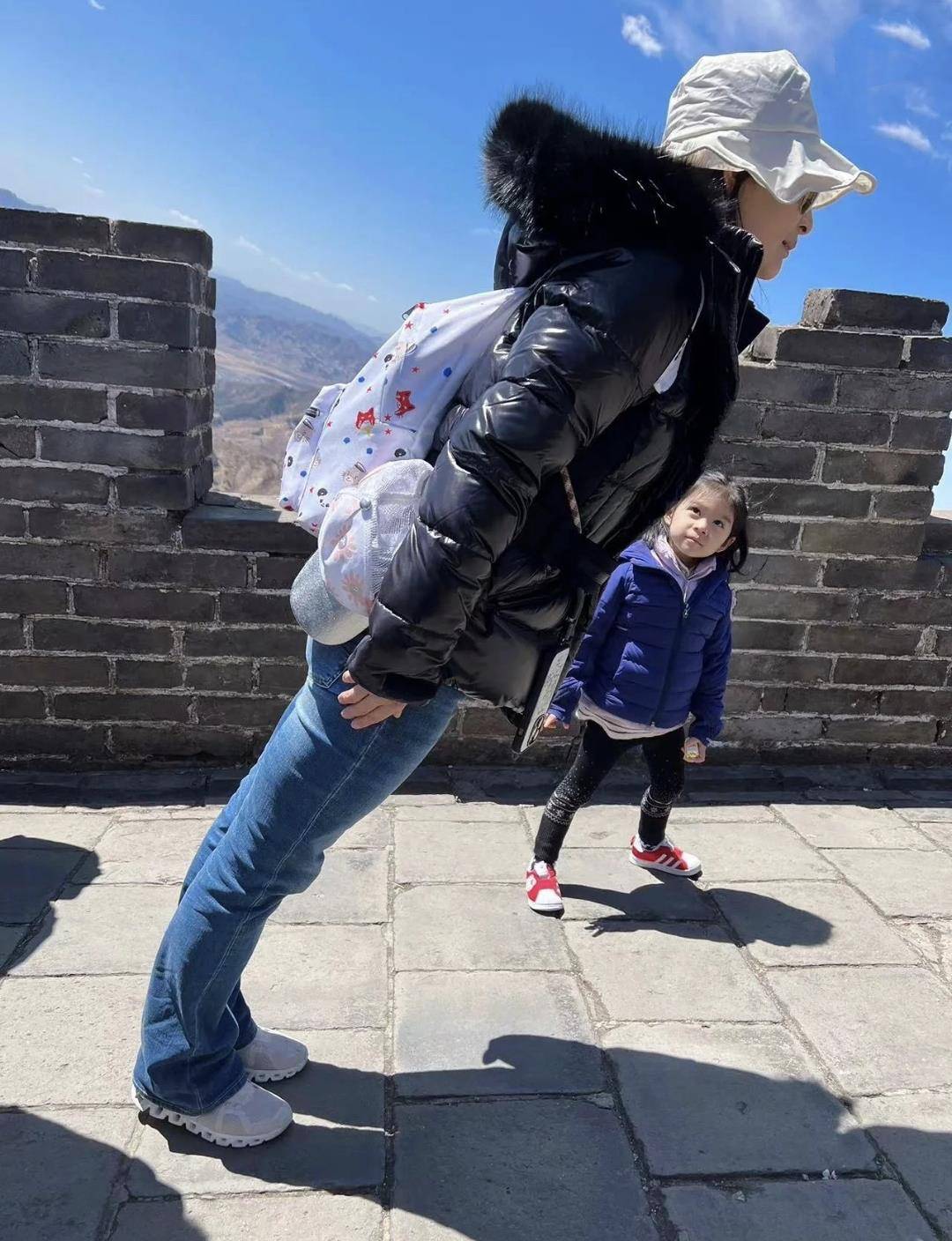 来西安之前,郭晶晶全家去爬了万里长城。妈妈做着尴尬的动作,小女儿目不转睛地看着,儿子也露出了脸。