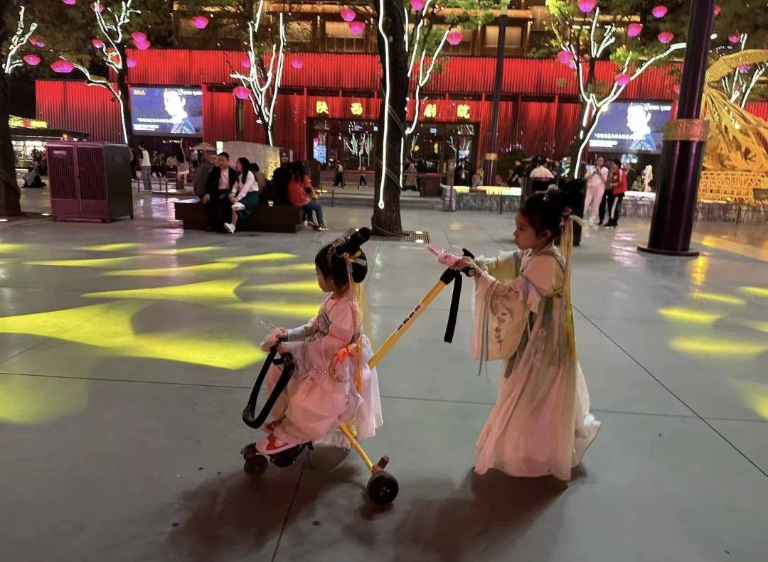 一家人来到大唐不夜城。两姐妹穿着汉服,戴着古装假发,就像两个小仙女。走在路上简直就是一道亮丽的风景线。
