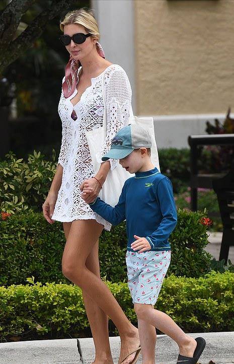 伊万卡向大家展示了完美的度假造型。伊万卡和老公撒完狗粮后,儿子终于现身了。伊万卡握着男孩的手,就像手足一般。