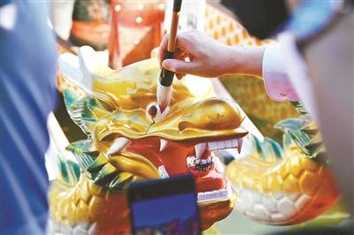 圆明园龙舟展演前,现场为龙舟“点睛” 摄影/本报记者 袁艺