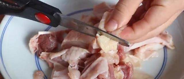 今天14块8毛钱买了几块老母鸡肉,培养一个特色做法,首先洗去血水,这样简单拆掉几股,骨头不要丢掉,可以用来炖鸡汤。再检查一下,看有没有骨头残留,再把它给剪成小块。