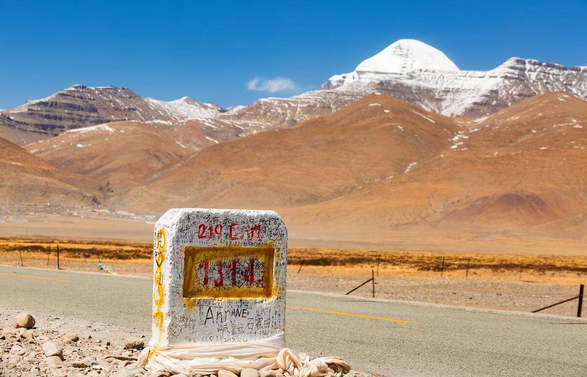 西藏商务区219国道-新藏线1314线纪念碑,背景为冈底斯山脉。