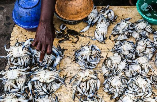 堆成堆的螃蟹,看起来还是十分的新鲜,非洲海岸线延长,有丰富的物产,海鲜在当地市场卖的是十分便宜的。