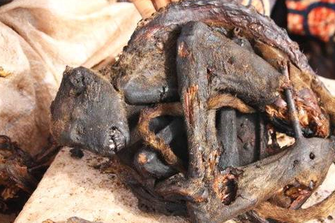 基本上,猎户在丛林里捉到什么小动物,商贩就会拿什么小动物来晒干或烤干。从蜥蜴到猴子,什么动物都有。有些被烤干的动物画面让人不忍直视,整个场面看起来十分血腥。