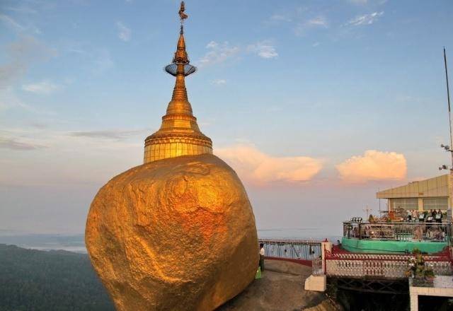 这块金光闪闪的大石头及其上的佛塔,共同构成了这一奇特景观。大金石高8.15米,重约611吨,是一块完整的花岗岩,石头上有一座7.3米高的佛塔。原本并非金色,而是后来被朝圣的人们用金箔贴满而变成金色的。