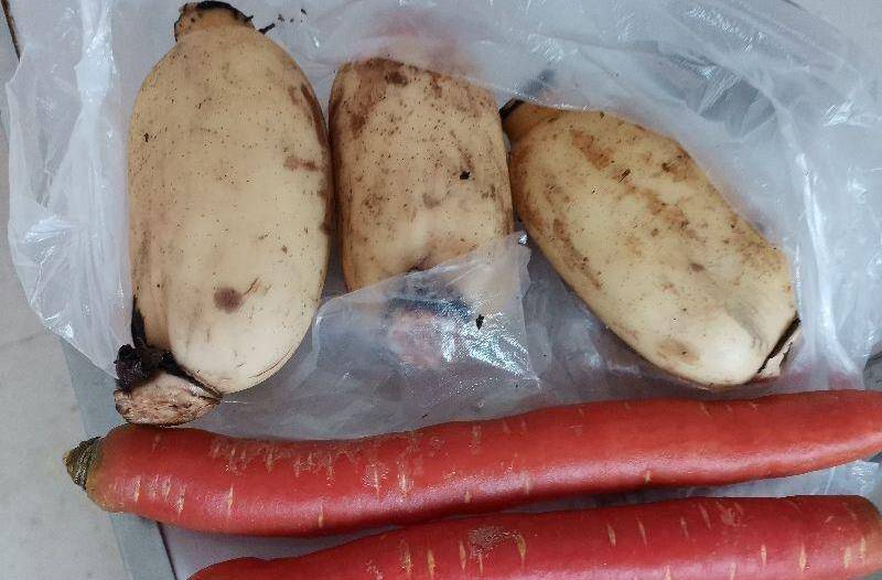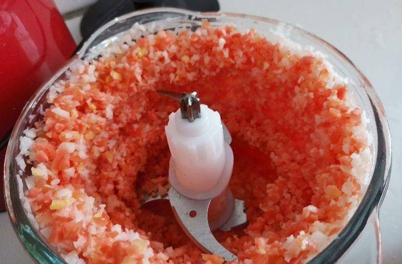 步骤三、萝卜用清水洗净,用刀切成小块放入绞肉机里,再用手把绞碎的胡萝卜捏干水分后放入汤盆里。