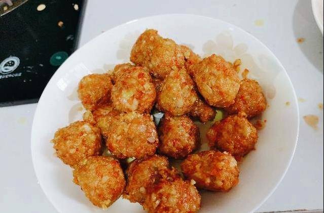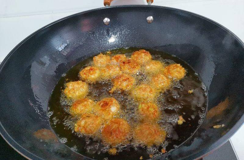 步骤五、锅里倒入半锅食油,油温成热,用手把搅拌好的食材揉成圆子,放入锅里炸。