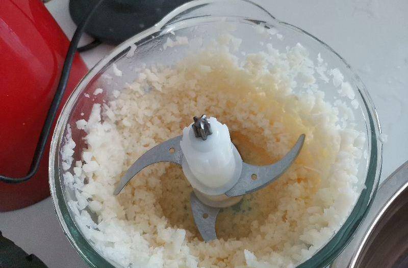 步骤二、用绞肉机把莲藕绞成碎末,再用手把绞碎的莲藕捏干水分后放入汤盆里。