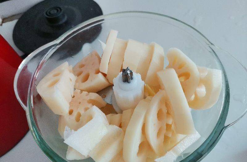 步骤一、先用刀把莲藕切去头部和尾部,再削去莲藕的外皮,用清水洗净用刀切成小块装入绞肉机里。