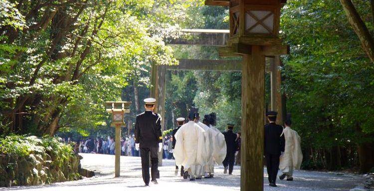 从御手洗场回到参道上,在往正殿的途中,有机会看到神职列队行进的场面。神职们穿着祭祀的白色斋服和黑冠,以及木制的鞋子浅沓,在警卫前后护送下前进,而且行进时还有交通管制,十分具有威仪。