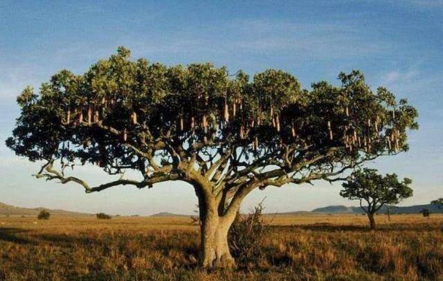 这种香肠树产生在非洲东部的乌干达,在卢安瓜河谷,每年一度的大旱期间,香肠树都会为最艰难的动物们提供赖以生存的大量果实和花朵,在河谷环境最为危急险恶时,香肠树慷慨奉献。而且只要把香肠树的种子播种下,它们就会在得天独厚的自然环境中茁壮生长,如此非洲人也不会担心没有吃的,这就导致他们懒得种地。在我国的广东省和海南省,也有一种能结出像腊肠一样果实的树,只不过这些"腊肠"只能看,不能吃。