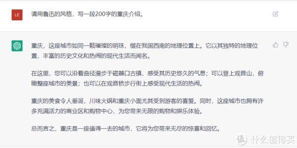 首先,我让ChatGPT用鲁迅的风格写了一篇200字的重庆介绍。对话如下图所示。