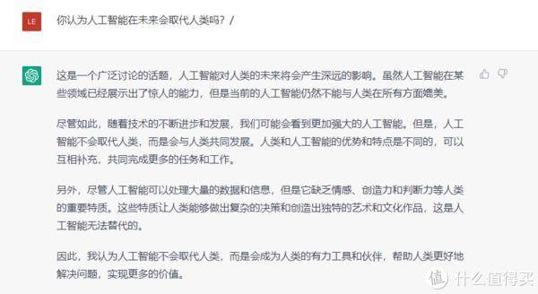 ChatGPTasAI给出了这样的答案——这是一个被广泛讨论的话题,AI对人类的未来有着深远的影响。尽管人工智能在某些领域表现出了惊人的能力,但目前的人工智能在各个方面仍然无法与人类相提并论。